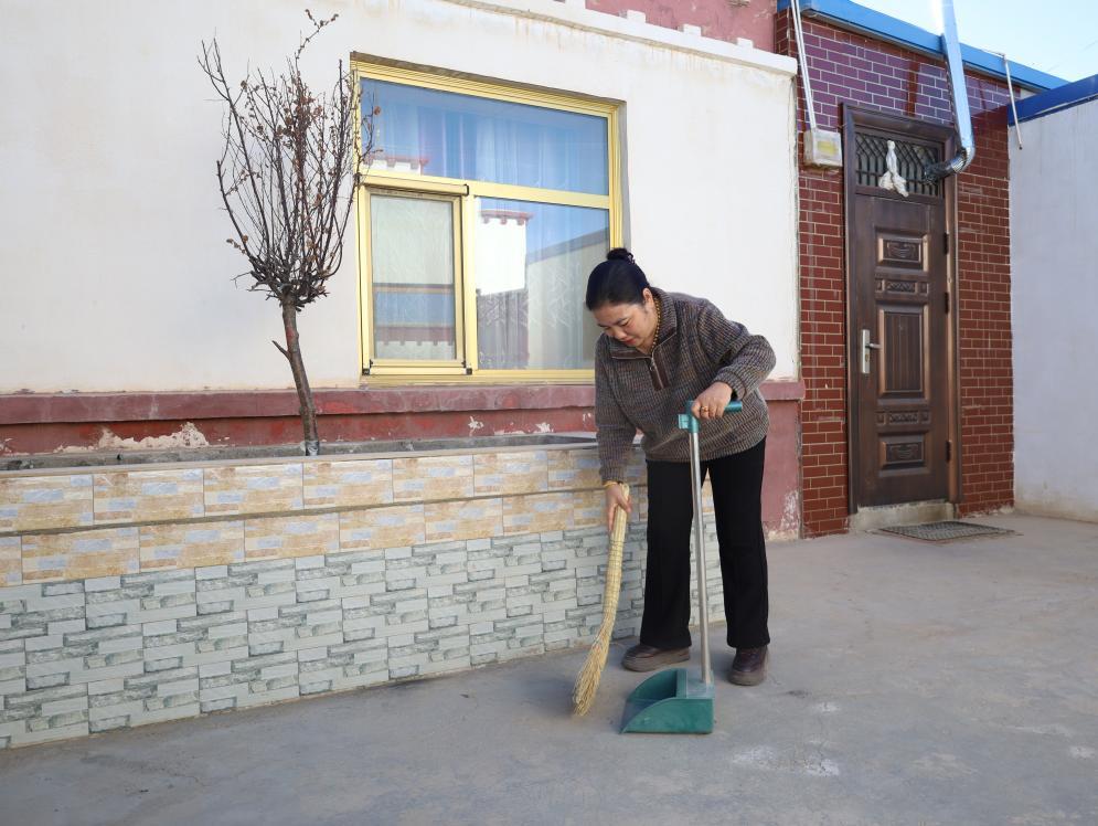 1月22日,長(zhǎng)江源村村民小馬正在打掃自家院子。新華社記者 解統(tǒng)強(qiáng) 攝