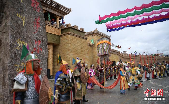 2019年9月16日,四川甘孜縣格薩爾王城暨百村產業基地舉行開城儀式,城內以格薩爾故事打造的景觀小品體驗地有1000余處,游客可聽《格薩爾》說唱、看《格薩爾》藏戲等。中新社記者 劉忠俊 攝
