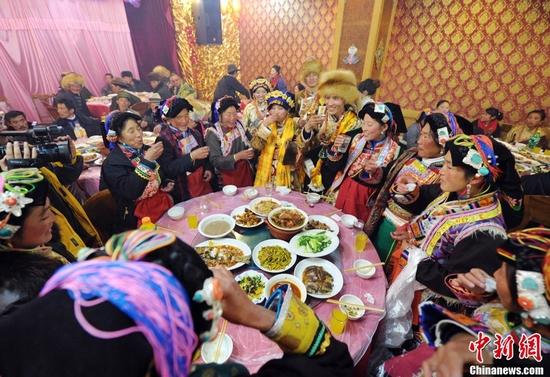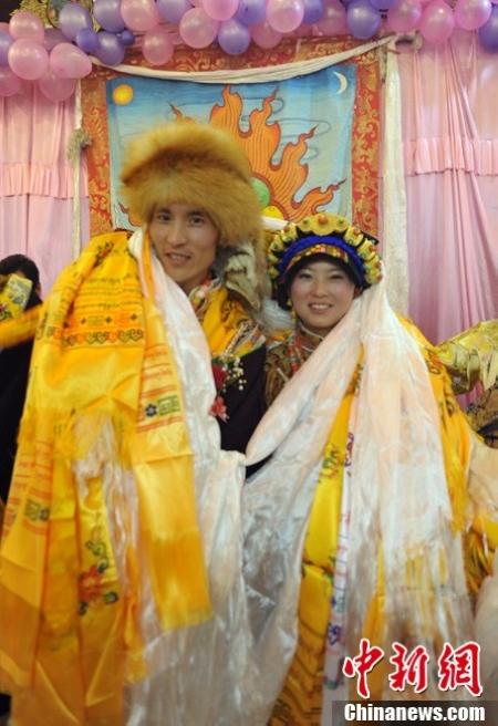 ????新郎舅舅羅爾依告訴記者,以前的藏族婚禮很簡單。婚禮當日,新娘帶著鋤頭、背簍等各種勞動工具,由家人送到新郎家,那時一般是騎馬或者坐牛車。新娘進了新郎家的大門后,要將事先準備好的禮物送給新郎的各個家人。新郎也要回送。接下來,新郎家的代表要出面把家里有多少人、牲畜、土地一一介紹清楚,囑咐新郎新娘好好過日子。新娘家的代表也有一番對新人的祝福和囑咐。
