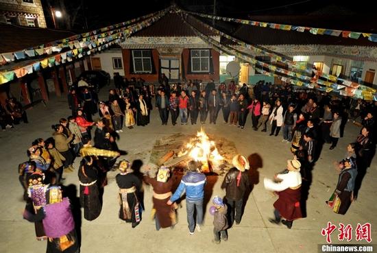 ????夜幕下熊熊的火焰將人的臉龐映成橘紅色,加柴火時激起的焰花像騰空的星子。老人們坐在篝火旁的長木凳上聊天,等人多起來了就陸陸續續加入鍋莊的圓圈,一起跟著音樂踩著古老的節奏舞起來。這樣的歡樂要持續到天明。(攝影:中新社發 劉忠俊)