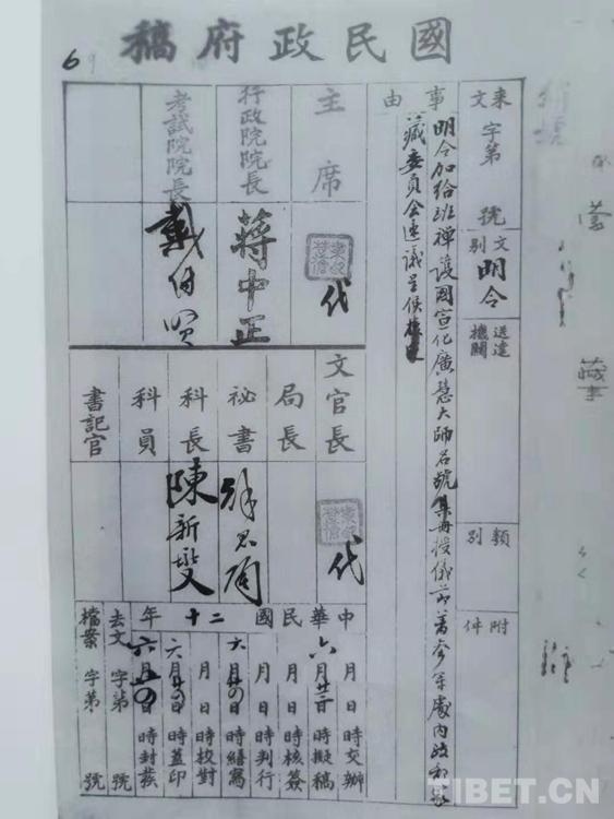 查班禪額爾德尼此次來京及覲見,面陳藏事,并參加國民會議,其擁護中央熱誠,洵堪嘉尚。且班禪通達教理,行持精嚴,康、藏各處喇嘛僧眾信仰至深。茲為對于各地喇嘛寺廟宣傳中央政令及撫慰信仰佛教民眾起見,擬請特派班禪額爾德尼為西陲宣化使,并得在青海、西康兩省境內選擇適宜地點組織行署,以便辦理一切宣化事宜。所有行署內部組織、經費數目以及班禪年俸,均經本會擬就詳細辦法,繕折呈奉蔣主席批示照準在案……