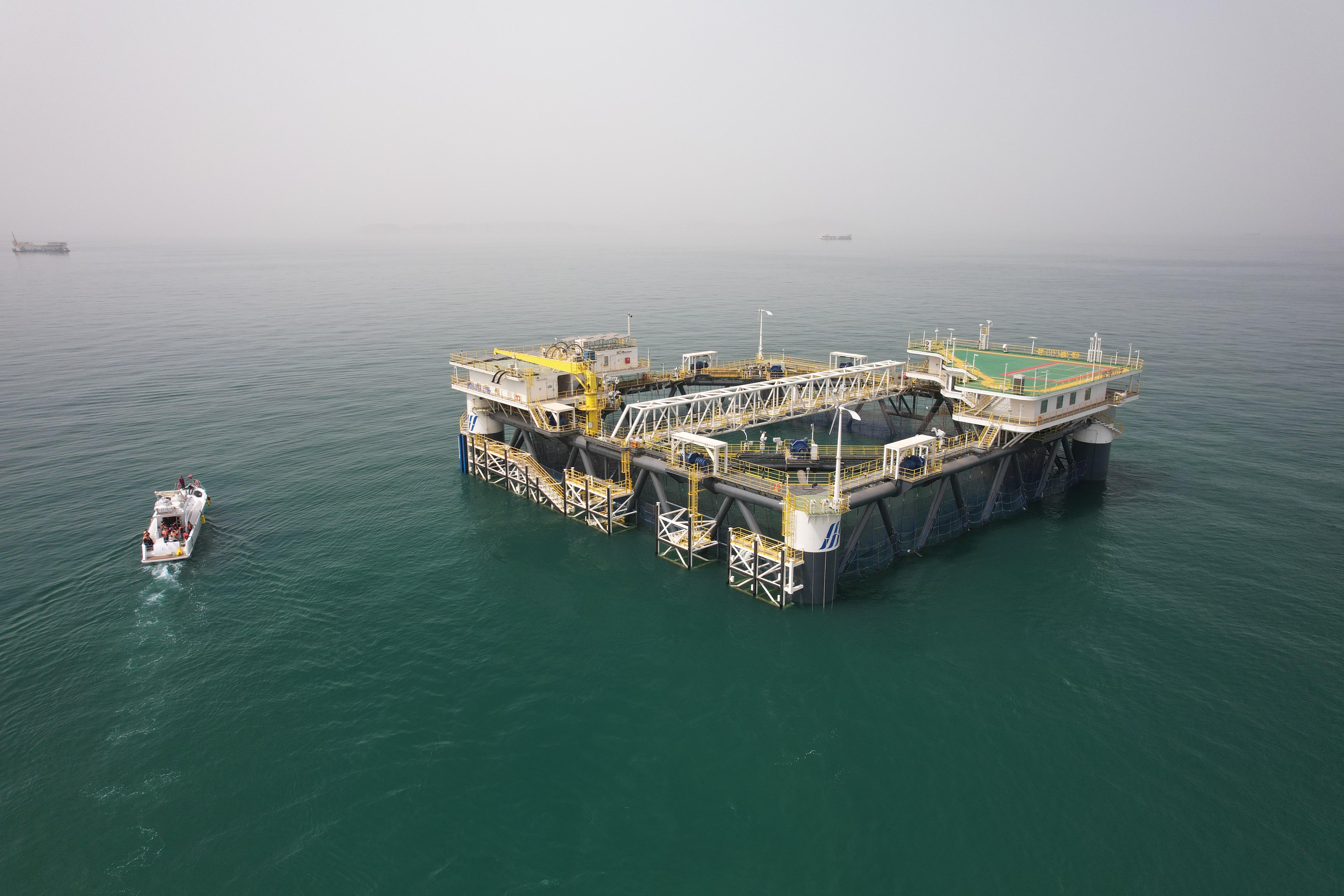從空中俯瞰,幾座龐然大物立于海面。它們是中集來福士海洋工程有限公司自主研發(fā)的“經(jīng)海”系列深遠(yuǎn)海智能網(wǎng)箱。站在船頭眺望,智能網(wǎng)箱平臺(tái)如同“海上城堡”矗立在海天之間。這些單體網(wǎng)箱底座長(zhǎng)寬均為68米,包圍水體9.4萬立方米,可養(yǎng)殖100萬尾魚。