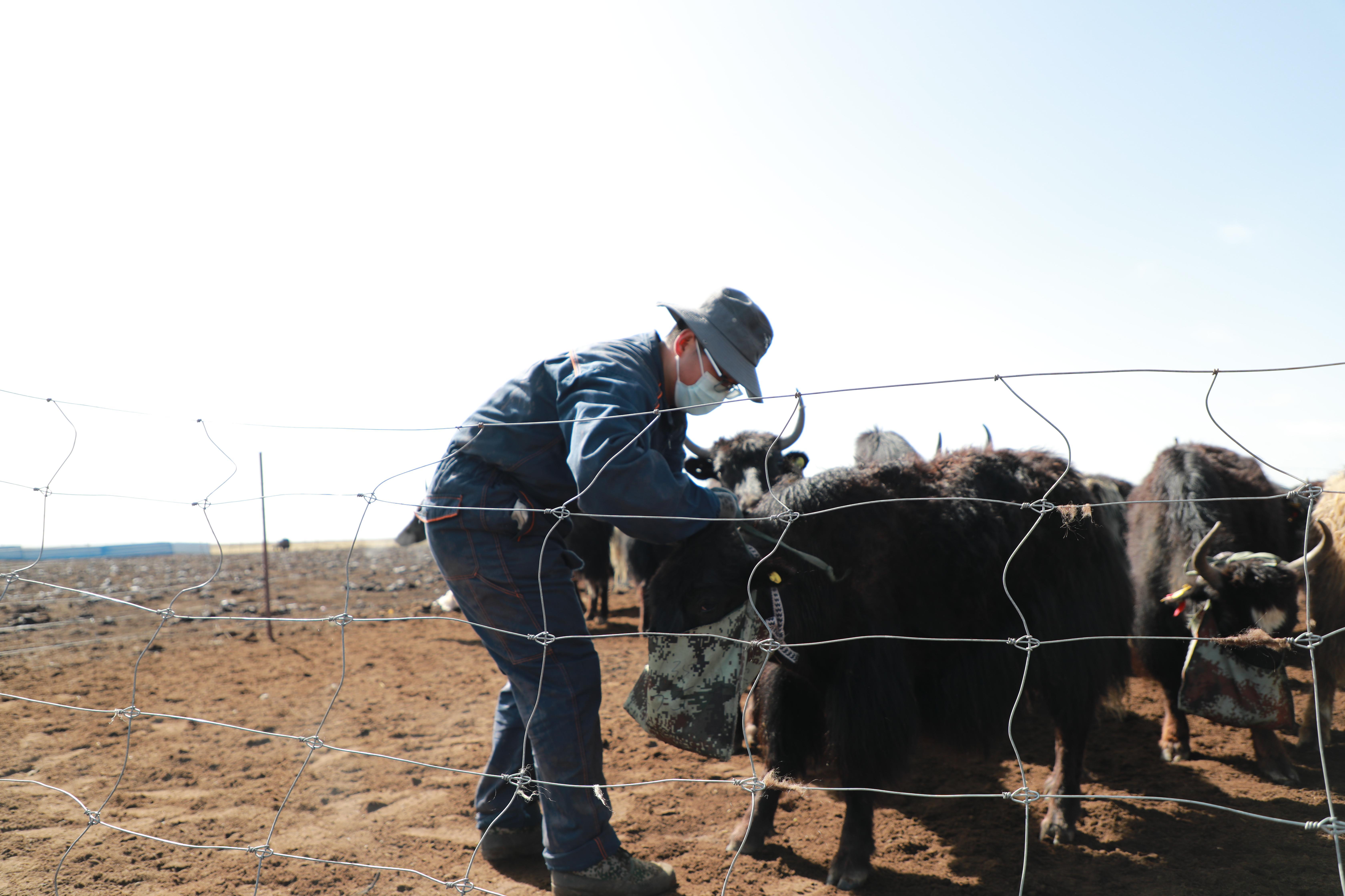 4月27日,在甘肅省甘南藏族自治州瑪曲縣的一片草原上,蘭州大學生態學院的在讀博士研究生曹澤在牛圈內給牦牛套補飼袋。新華社記者 文靜 攝